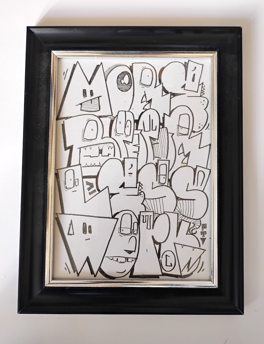 5 BRAND NEW Original art work from Broke One 5x7 ink frame draws ready to be displayed at home or office space or random street corner. Each art work come with a small hand draw sticker pack and 160z beer koozie.